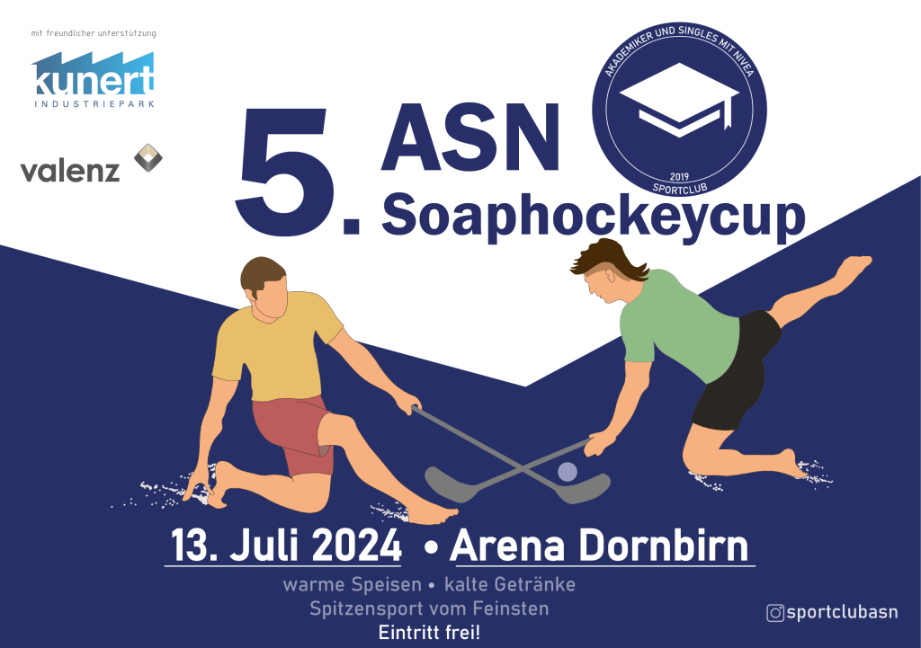 Am 13. Juli 2024 wird der ASN Soaphockeycup zum bereits fünften mal in der Arena Dornbirn ausgetragen. Auch heuer dürfen wir wieder behaupten, neben dem Alberschwender Kieselstein-Schönheitswettbewerb und der finalen Qualifikationsrunde für das Weitspringen der Ameisen in Brand, zu den absoluten Hochkarätern im diesjährigen Vorarlberger Sportkalender zu zählen.